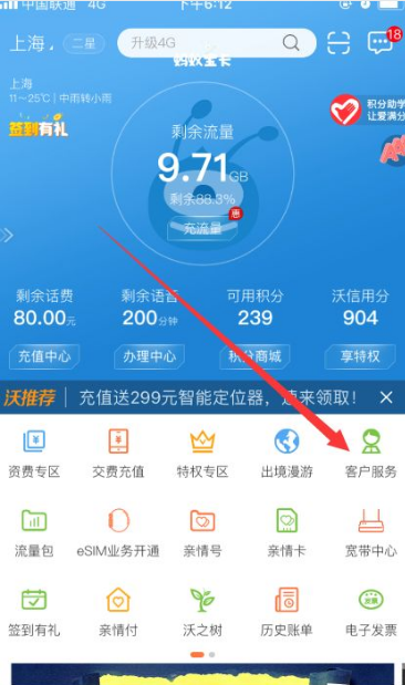 进入联通网厅首页后,如下图所示,找到客户服务入口。点击并进入。