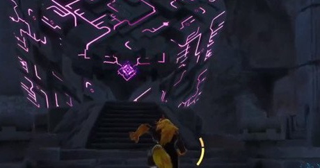 腾云驾雾地宫是全图隐藏宝箱密度最高的区域之一,多数宝箱需通过环境互动或机关解谜触发。首处宝箱位于主入口附近:靠近区域起点后,可见一个紫色电箱,将其向左推动,使其精准嵌入左侧断开的电路接口。通电后,前方封闭门自动开启,宝箱即显露于门后开阔空间中央。