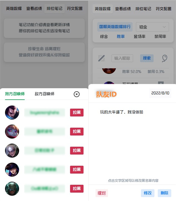 7、还有一个人性化功能,叫做“排位日记”,你可以将遇到睿智队友记录下来,