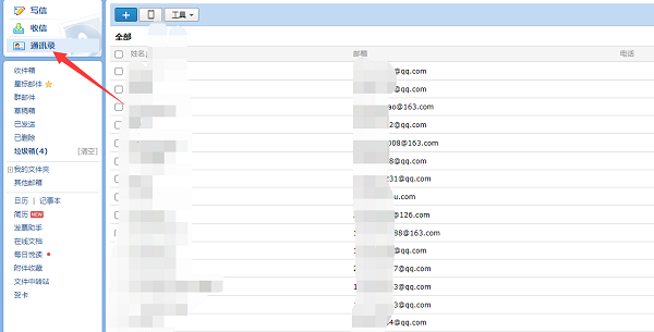 4、而点击左侧的“通讯录”则可以看到你好友的邮箱地址以及对应的qq号码。