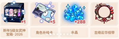累计登录可领取「新年S级女武神宝箱·2026」×1、角色补给卡×5、吉络云华绶带、水晶等奖励