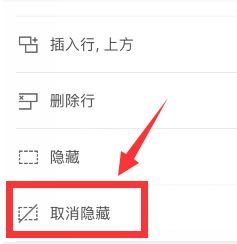 选择隐藏行的上一行,点击“行列”后,可以点击“取消隐藏”即可恢复数据行的显示