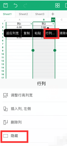 选择数据列后,点击“行列”,点击“隐藏”即可隐藏数据列