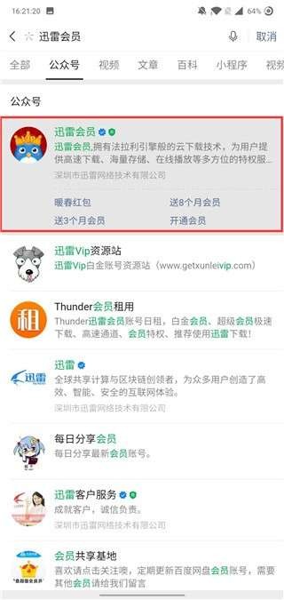 第一步需要打开微信搜索功能,输入"迅雷会员"关键词查找对应公众号。