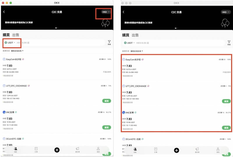 2.进入交易界面后,首先选定琺幣类型【HKD】,再选择目标币种如USDT或BTC。根据支付方式筛选合适商家广告,确认后点击【购买】按钮