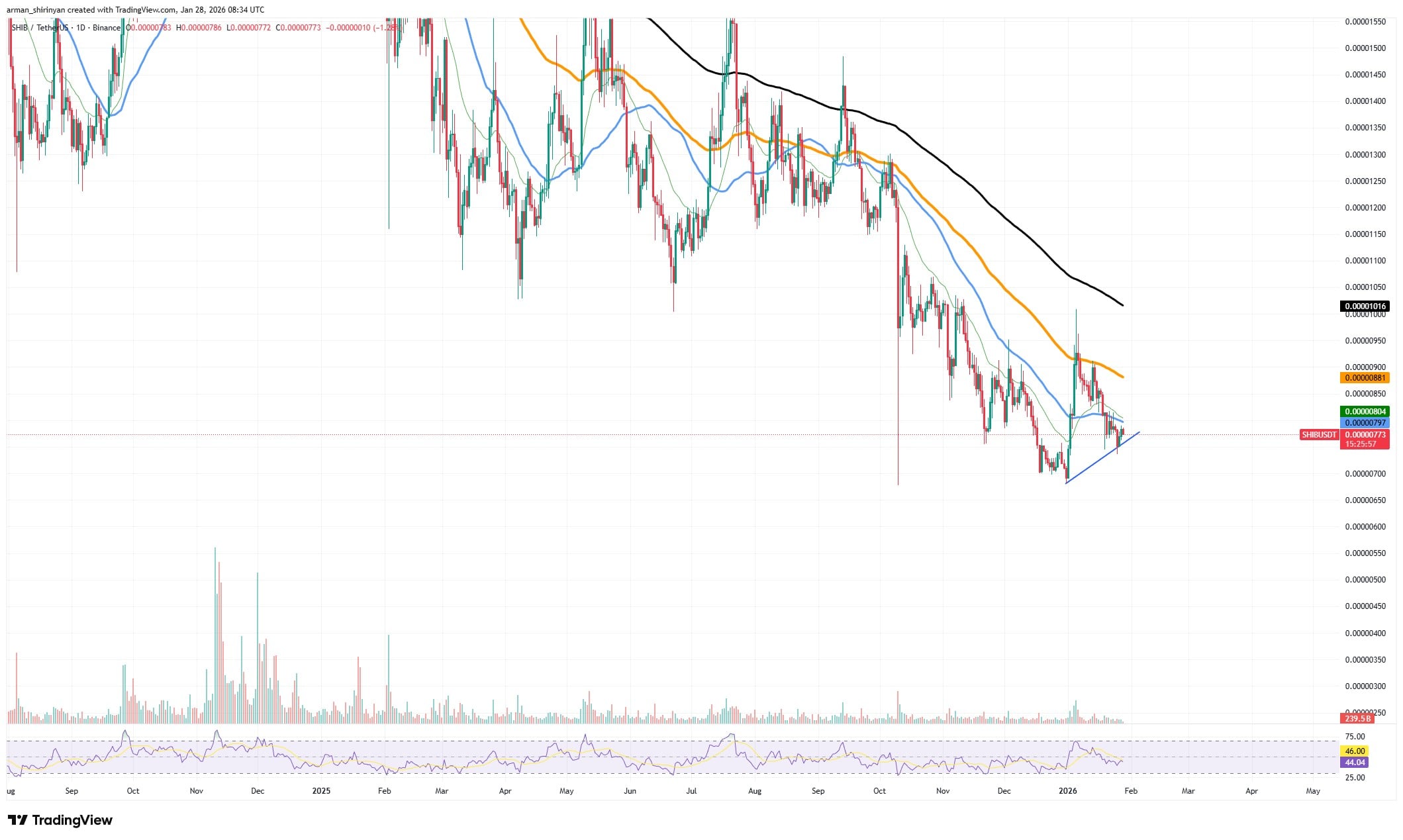 SHIB价格当前被压缩在下方上升趋势线与上方50日均线之间,形成持续收窄的通道。在当前市场条件下,这种横盘整理状态难以长期维持。尽管近期价格表现疲软,但呈现可控式下跌,表明市场压力正在积聚而非消散。