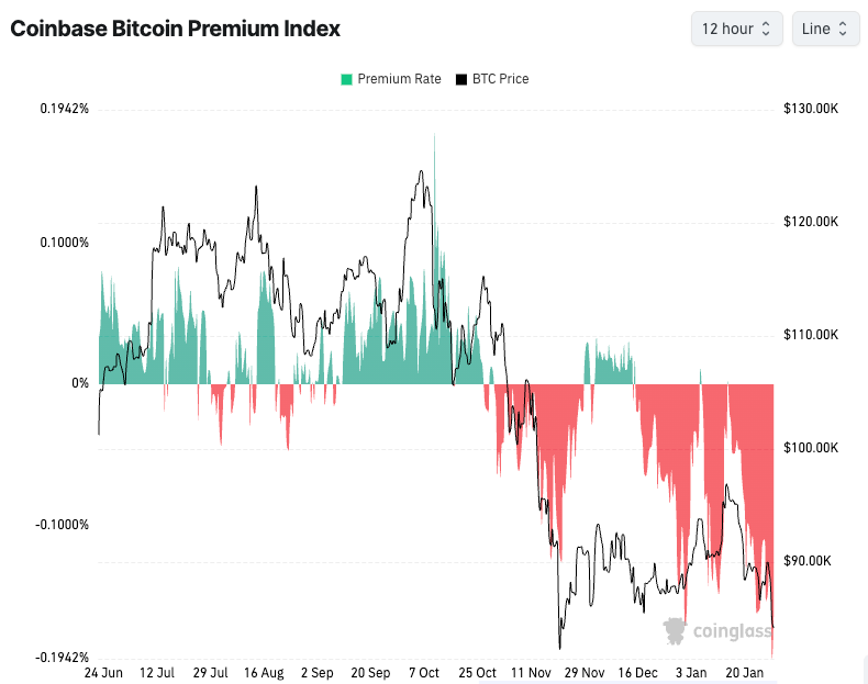 Coinbase溢价指数(追踪Coinbase与全球交易所价差,反映美国机构兴趣)亦转为负值。两项指标均表明推动2024-2025年涨势的机构买家兴趣减退。