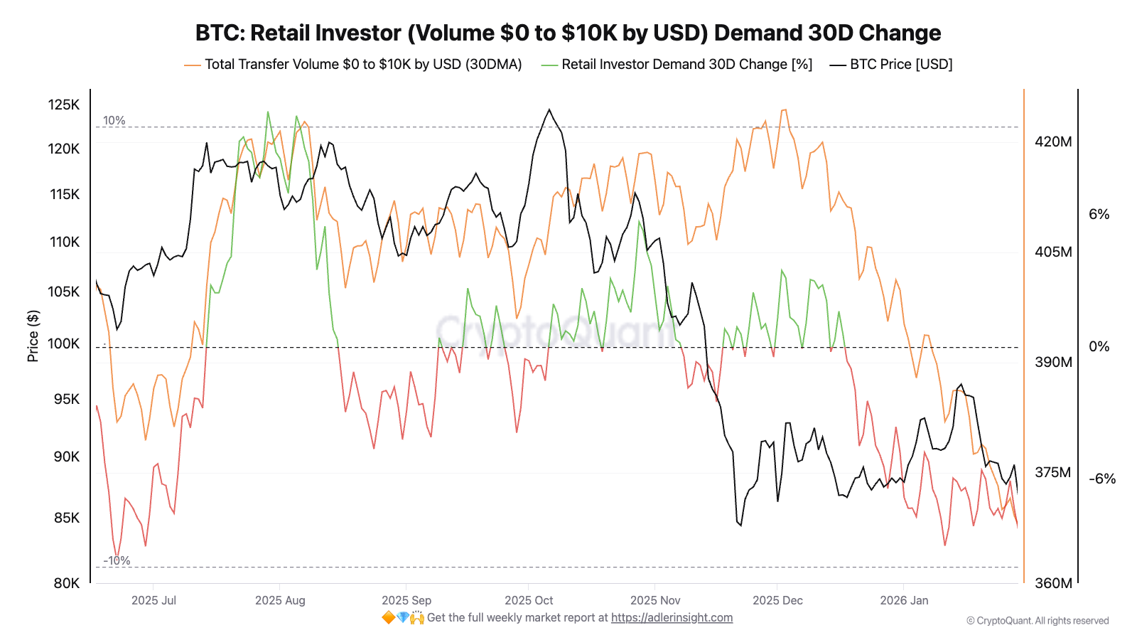CryptoQuant链上数据显示,0至10,000美元区间的小额交易持续下降,30天需求增长率从10月的10%以上降至目前的-6%。