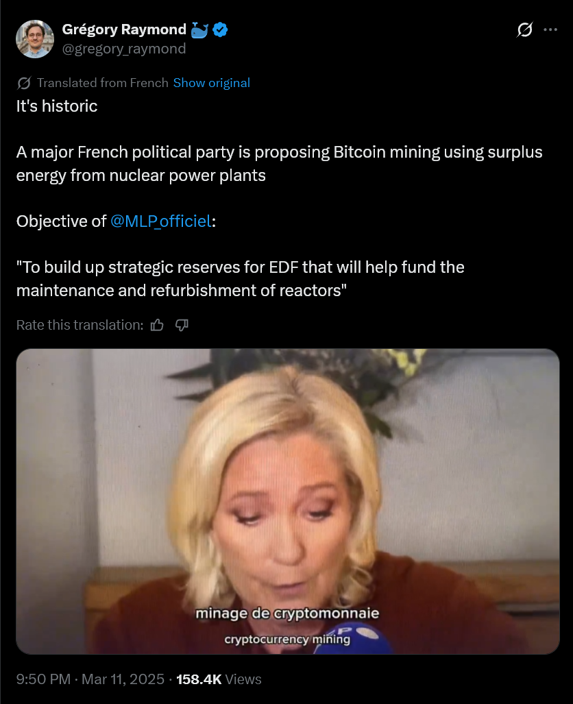 国民联盟党魁玛丽娜·勒庞的加密立场经历显著转变:2016年她曾誓言封杀比特币等"统治精英与华尔街投行共谋产物";2022年转为支持监管;2025年更提议法国自主发行加密货币。去年三月,她参观弗拉芒维尔核电站时,甚至支持利用过剩核电开采比特币。