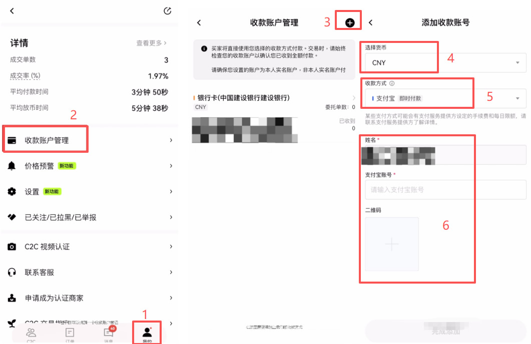 点击右下角的“我的”,向下滑动找到**“收款账户管理”。点击右上角的“+”号添加收款方式。货币选择“chy/r民币”,收款方式推荐选择支付宝或银彳卡。按提示输入账号并上传收款二维码即可。