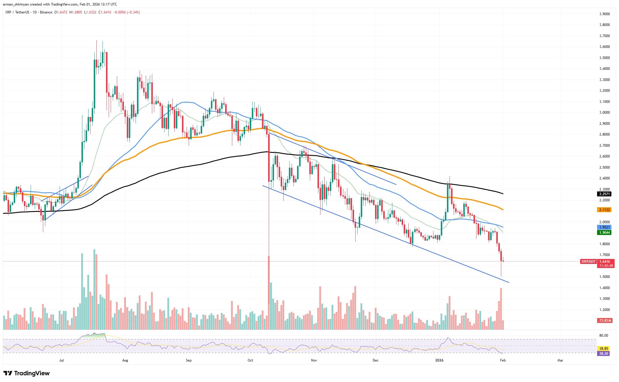 自数月前突破3美元大关后,XRP日线图便陷入持续阴跌。经典熊市结构已然成型——每次反弹高点逐步下移,随之而来的抛售又创出更低低点。最新这轮暴跌更使XRP接连击穿多个支撑位,包括12月横盘期间的趋势线支撑。