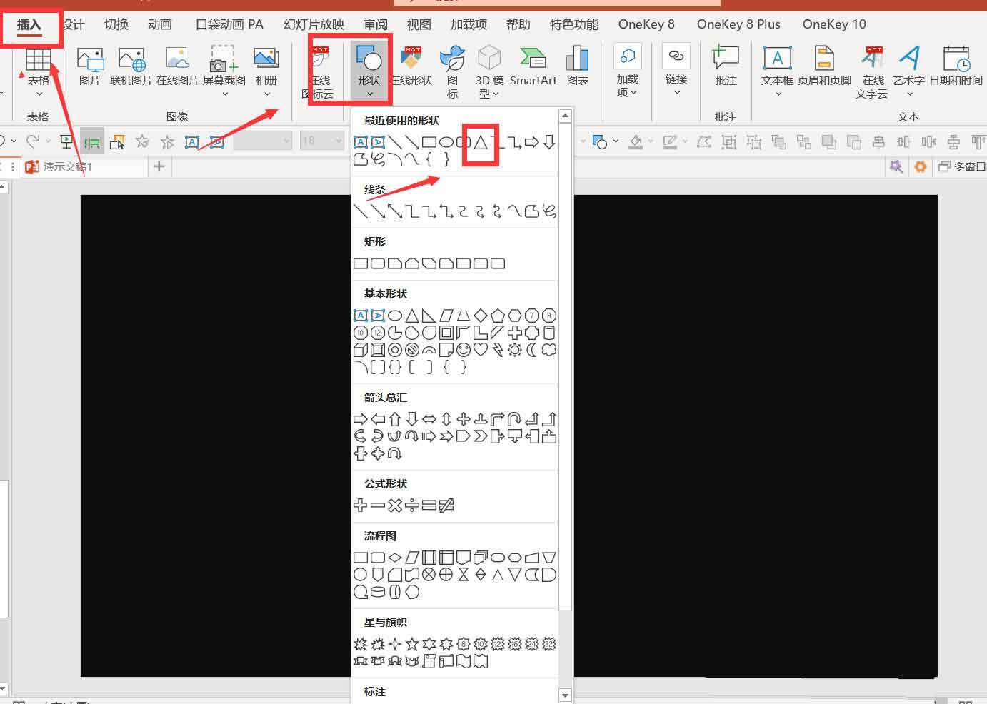 1、点击【插入】-【形状】-【三角形】-按shift键绘制三角形。