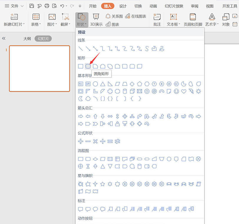 1、在插入选项卡中点击形状,选择其中的圆角矩形。