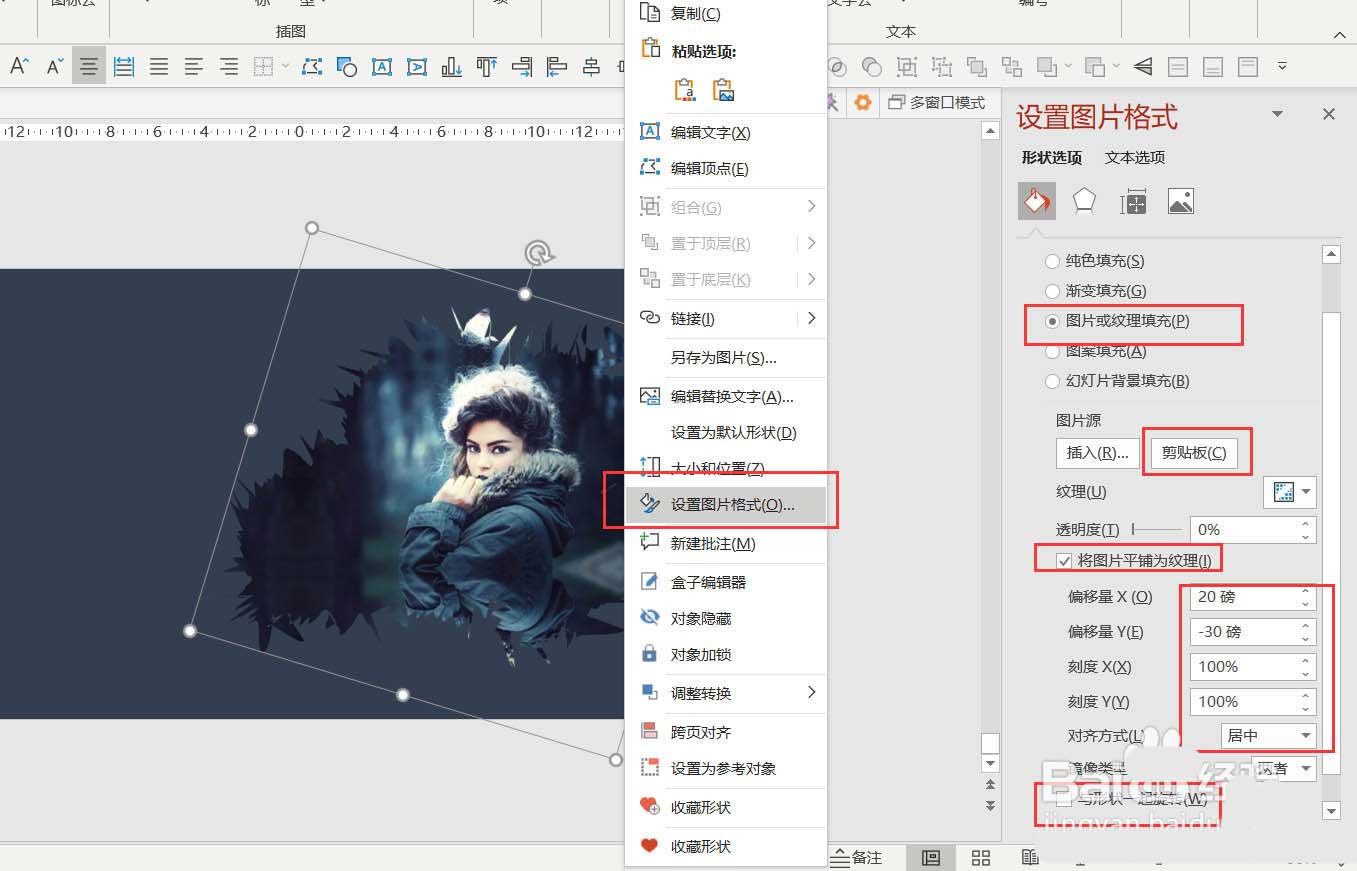 3、按Ctrl+X剪切图片-右键点击曲线图-设置形状格式-图片或纹理填充-剪贴板-勾选将图片平铺为纹理-调整偏移量和对齐方式-将与形状一起选择的勾去掉。如图4