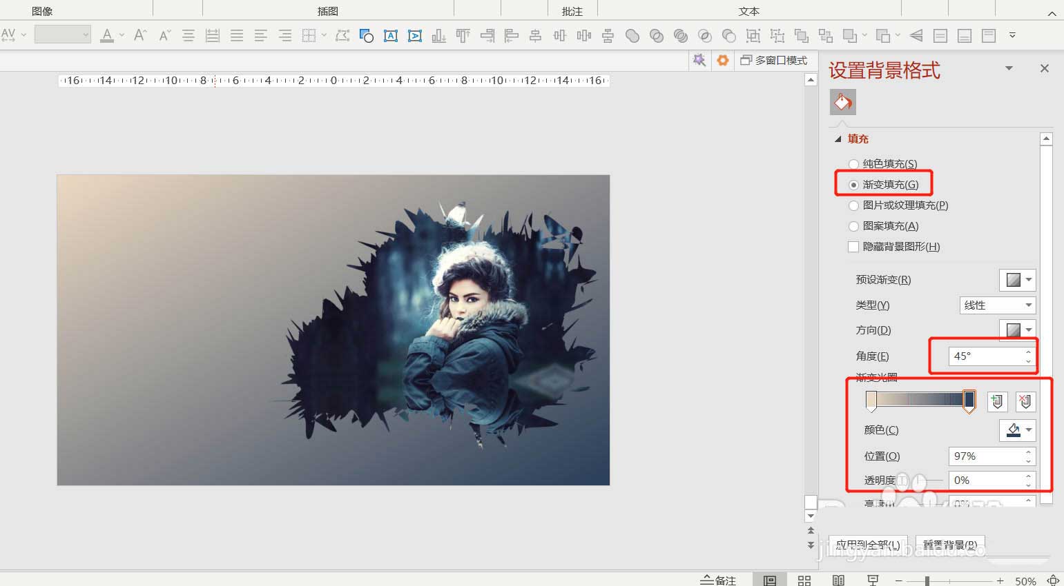 4、点击PPT背景-渐变填充-角度45-左光圈颜色:人物皮肤-右光圈颜色:人物衣服,如图5