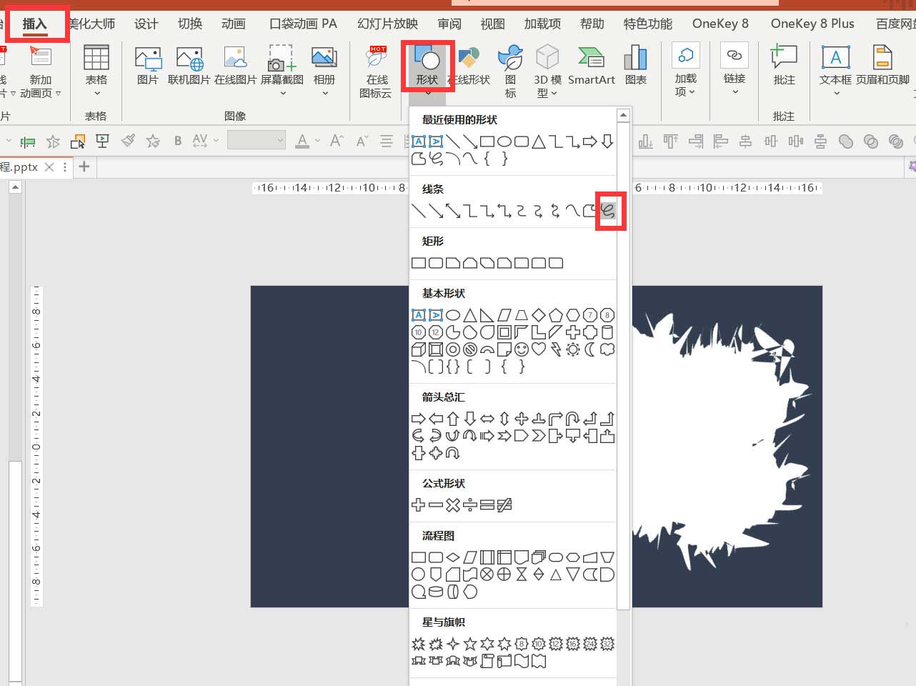 1、【插入】-【形状】-【自由曲线】-随意绘制曲线,如图1-2