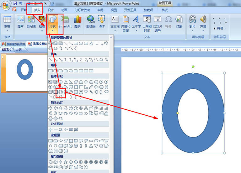 1、在插入\形状那里点击选择同心圆,在编辑页面画一个椭圆形的同心圆。