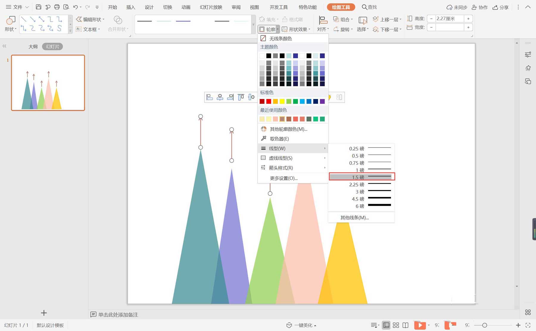 5、选中所有的箭头,在绘图工具中点击轮廓,选择合适的颜色进行填充,并调整线条宽度为1.5磅。
