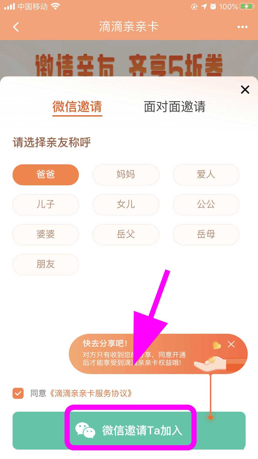 7、完毕后,点击【微信邀TA加入】,分享到微信,亲友加入后,就会开通亲亲卡并可以给亲友代付车费;