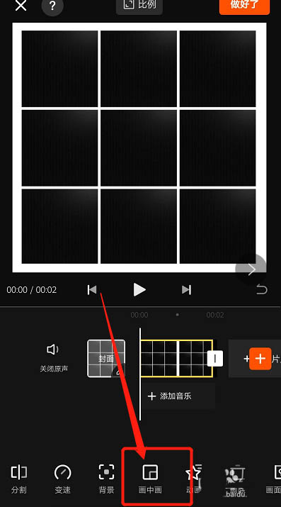3、然后打开快影,导入九宫格图片,点击画中画。