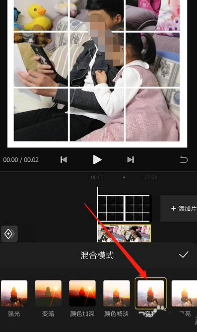 4、添加视频,将视频铺满九宫格,然后点击混合模式。