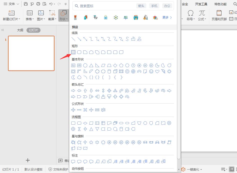 1、在插入选项卡中点击形状,选择其中的矩形,在页面上绘制出形状。