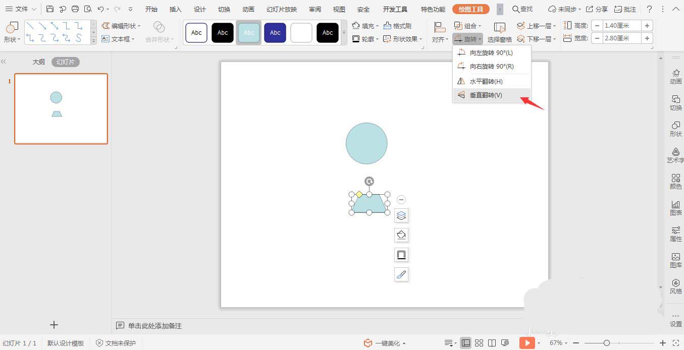 4、选中梯形,在绘图工具中点击旋转,选择其中的垂直翻转。