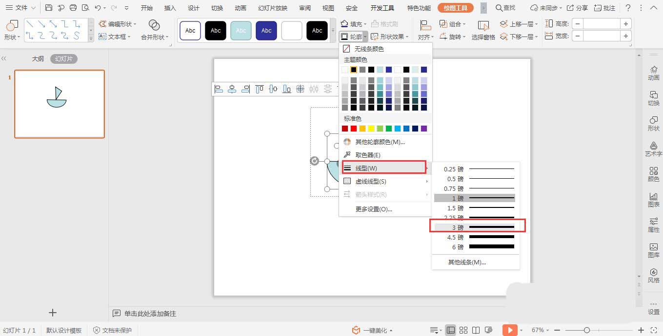 5、ctrl+A选中所有的形状,在绘图工具中点击轮廓,线条颜色设置为黑色,线条宽度为3磅。