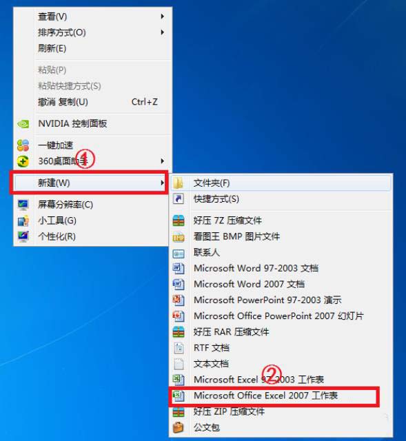 1、点击鼠标右键,选择新建选项,然后点击mircosoft office Excel 2007选项新建一个Excel文件。