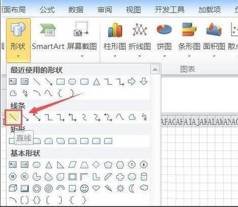 5、点击插入选项,在其子级菜单里找到线条里的直线选项。