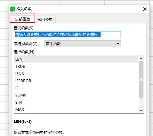 4、在【插入函数】窗口中单击选中【全部函数】选项。