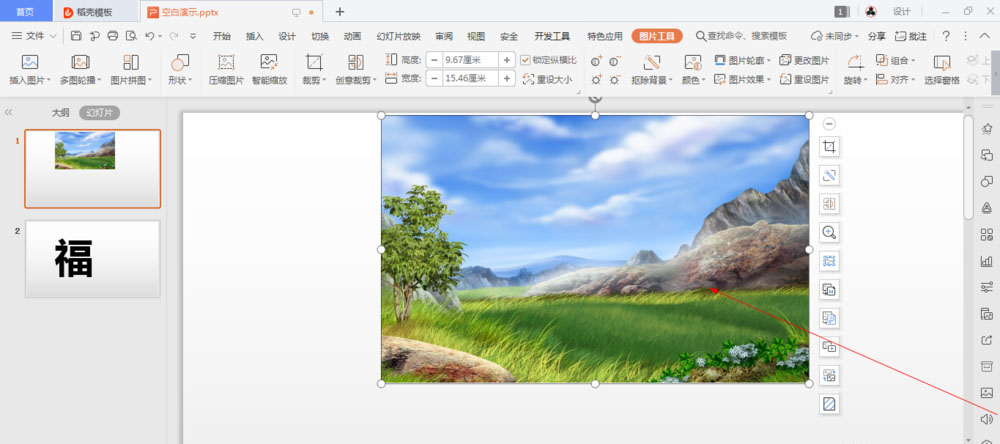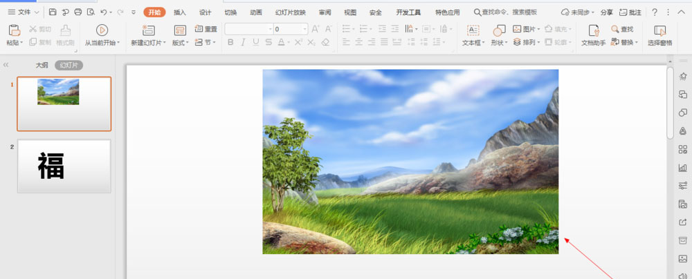 1、如图所示,这是幻灯片中的一张图片,我们为这一张图片添加上推动的声音,为大家演示这个图片上添加推动声音的方法。