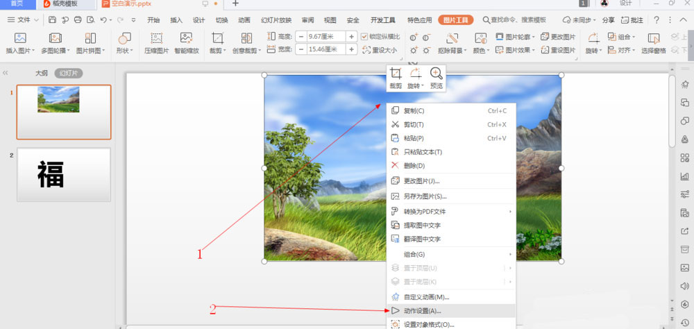3、如图所示,我们在这一张图片上鼠标右击,在弹出的下拉列表菜单中,我们点击箭头所指的动作设置(A)...选项。