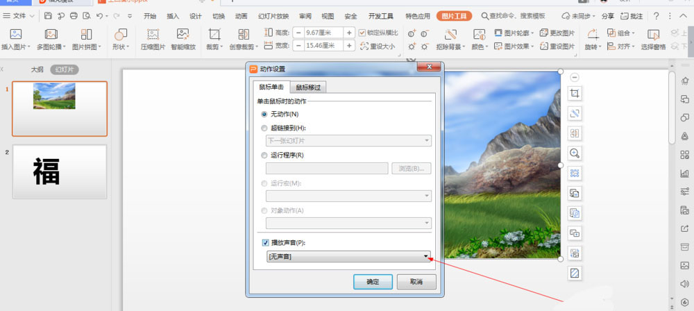 4、如图所示,在弹出的动作设置对话框中,我们勾选箭头所指的播放声音的方框。