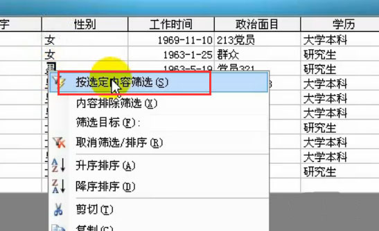 3、接下来我们就随便选中一个性别为男的单元格,如下图所示,然后右键单击选择按选定内容筛选