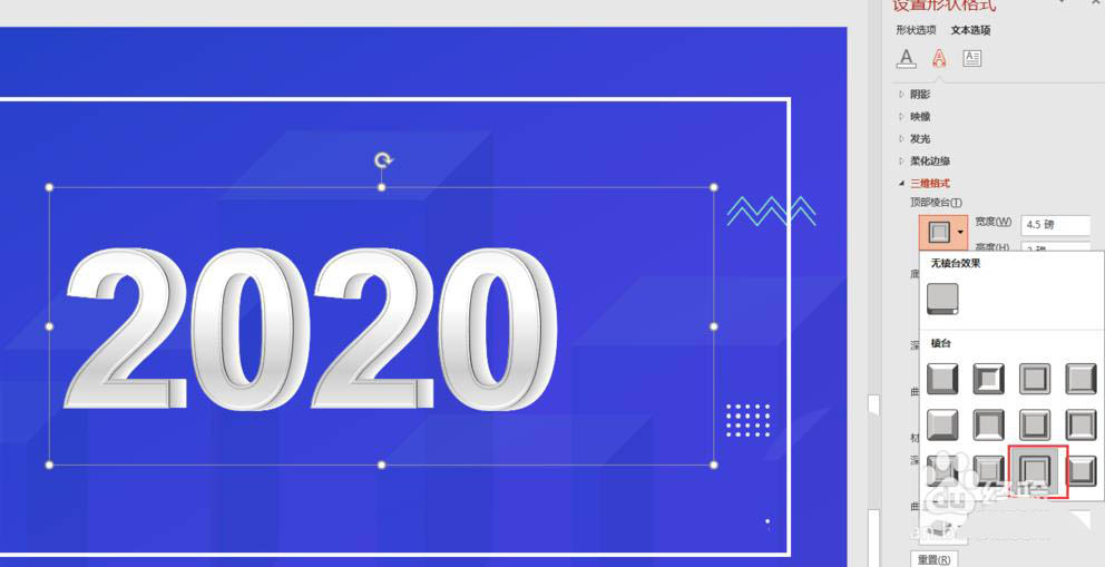 选中首页文字 » 设置文字效果格式 »渐变填充»渐变光圈(灰-白-灰-白),选中首页文字»文本选项»三维格式»顶部棱台»棱台(硬边缘)。