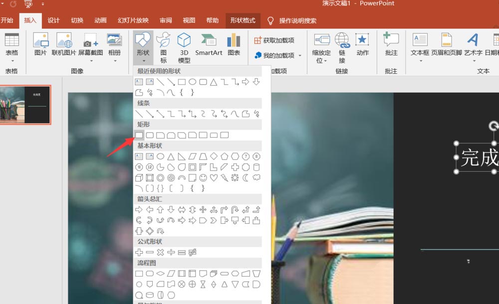 3、输入之后,我们点击上方的插入,选择形状,插入一个矩形。