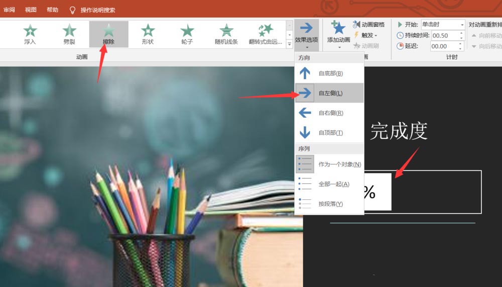 9、接着我们设置擦除下面的效果选项,为自左侧擦除。