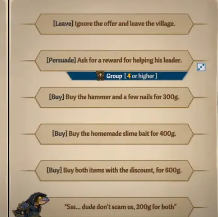 黏黏:第二层选择绿区,前往蜥蜴人部落选择购买600块两样都买,然后前往地图下方蜘蛛洞,在洞内前往剧毒之河触发桥上的史莱姆事件,选择抛出诱饵。