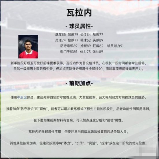 新手阶段好后卫相对来说更难获得,瓦拉内虽然属性不够出众,但对新人玩家来说很长一段时间都是后防线上的主力。