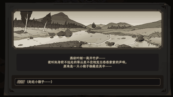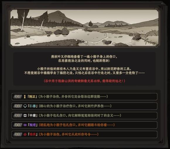 小猴子因为谷中的猴群打架而负伤,向你求救。在这个界面,你会第一次面对【立场选项】: