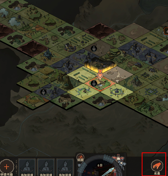 图中红色方框圈出的,就是采集键。采集不同的素材,有可能会得到道具,在此你可以不光采集食材,也采集点别的道具,反正无论你采多少野菜,道士都不会放你过去的()。