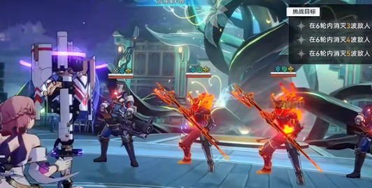 1、轮次目标:6轮内消灭3/4/5波敌人,梯度目标设计,引导玩家规划速清或续航策略,强化「轮次把控→战术选择」的博弈空间。