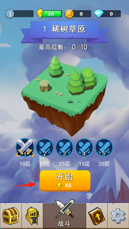 1、关卡选择选“稀树草原”关卡,点“开始”,消耗闪电(×5),进入冒险地图,挑战层数(0/10)。