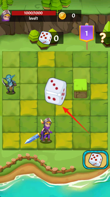 2、骰子移动投掷骰子(白色点数),决定角色步数,在方格地图行走,遇敌人(哥布林)触发战斗。
