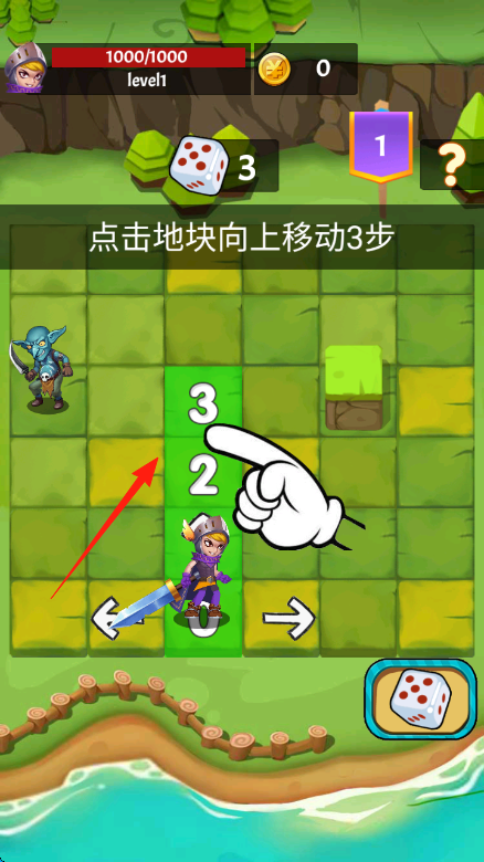 3、策略推进按骰子点数(3步),点击绿色路径移动,规划路线,避开危险,收集金币道具,提升等级level1。
