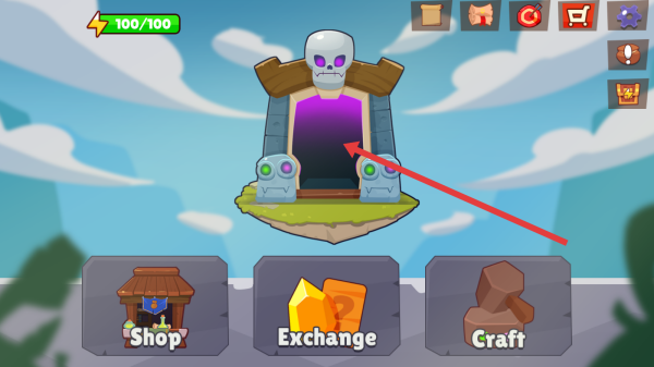 2、在主界面,点击骷髅头建筑(紫色传送门),进入副本或新场景,触发冒险任务。