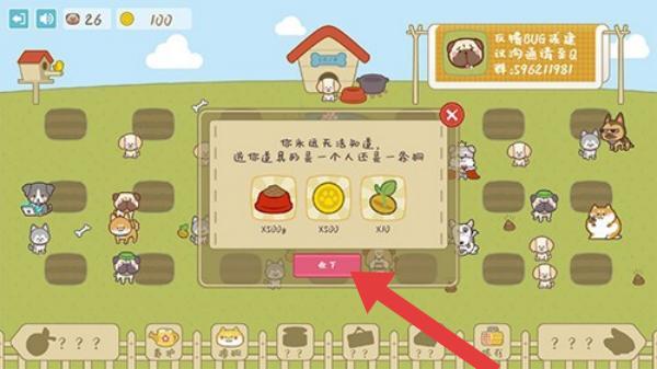 3、实体信息有游戏内货币(26、100)、弹窗文字“你永远无法知道,选你这里的第一个人还是一条狗”及奖励选项,属于狗狗饲养养成类,玩家可体验收养、喂养狗狗等玩法。