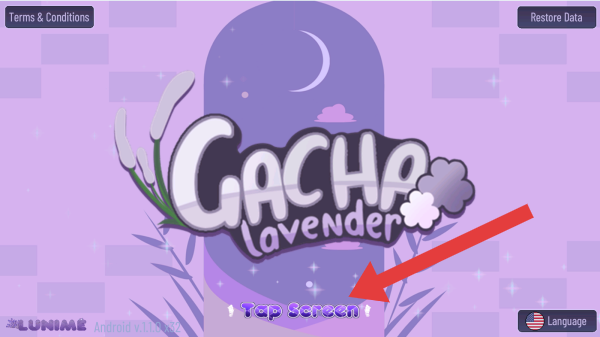 1、实体信息有名称“GachaLavender”、提示文字“TapScreen(点击屏幕)”玩家点击屏幕可进入游戏,体验加查系列的角色养成、装扮等玩法。