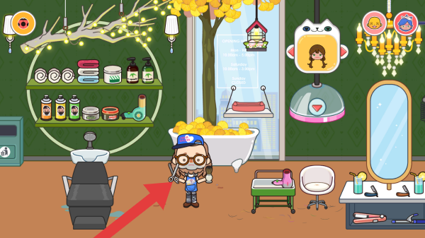 3、呈现了卡通风格的美发店布局,包含美发工具、产品陈列、角色(拟人化人物)等元素,玩家可操控角色进行美发等模拟经营互动,属于丰富场景玩法的一部分。